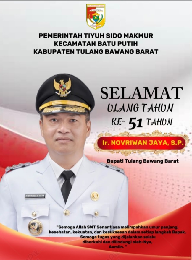 Pemerintah Tiyuh Sido Makmur Kecamatan Batu Putih Mengucapkan Selamat Ulang Tahun ke-51 kepada Bapak Ir. Novriwan Jaya, S.P. Bupati Tulang Bawang Barat